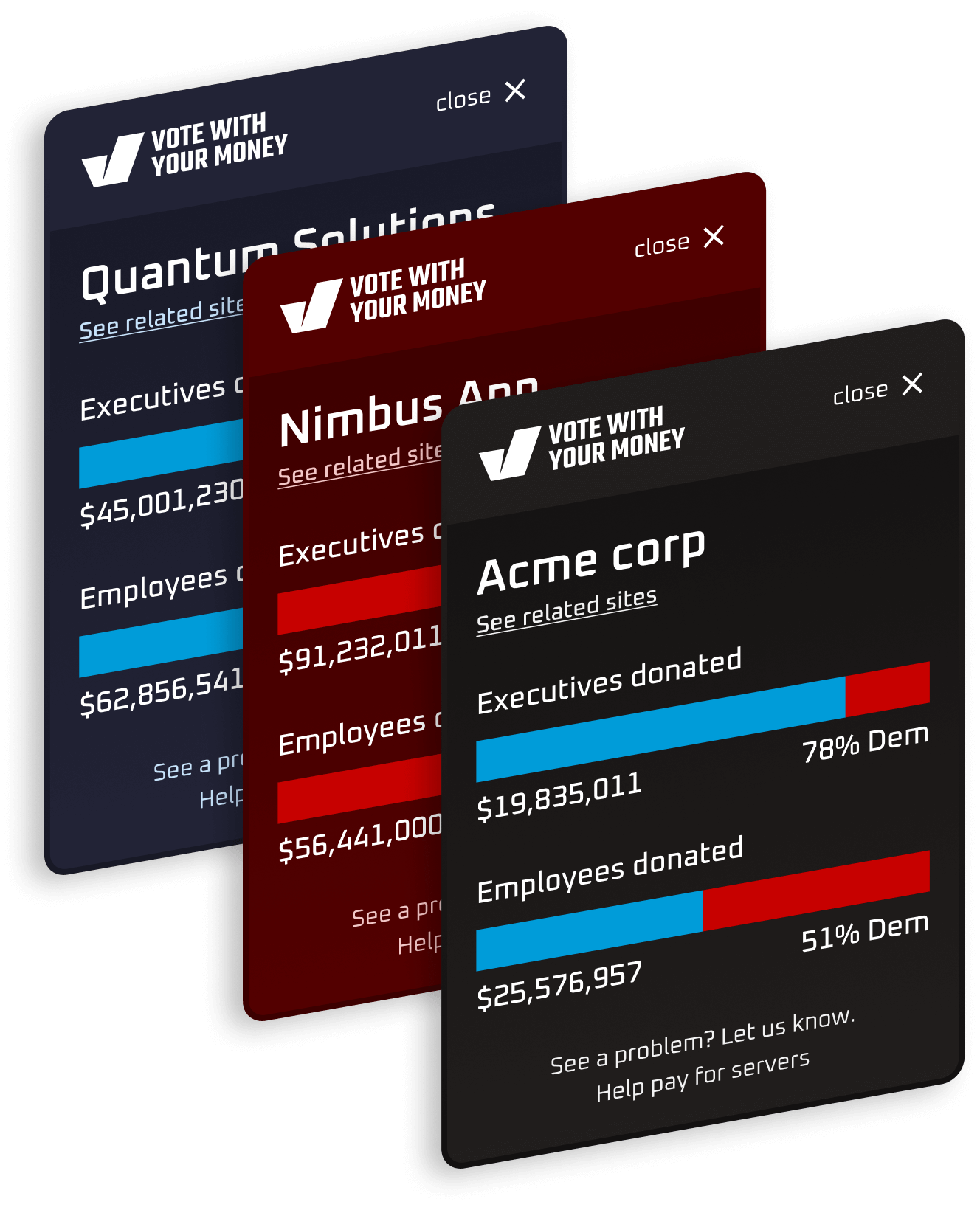 When you visit a website, our system uses AI to find the corporate ownership of the website, the executives of that corporation and then it searches the donations database for people who work at that company and any donations by the executives. Again, AI is used to categorize the recipients by party affiliation and we leave out any donations to non-partisan organizations or those of unclear associations.